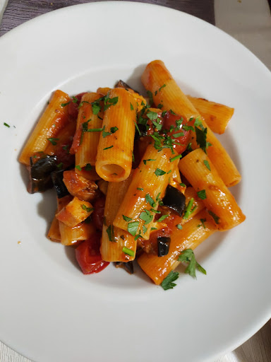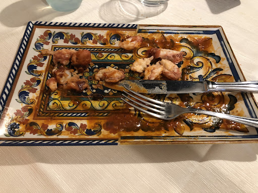 This restaurant has a brightly lit, spacious indoor room - several tables were occupied by Italian families - and a long warmly lit outdoor courtyard decorated with suspended paper parasols. The food was fine. We had two pasta dishes, which were nice - my Paccieri was seriously chewy, which I didn't mind - followed by deep fried battered calamari and prawns (fried fish of the day) and grilled squid. The fried fish was fresh. The squid was rubbery and dry - it was a good jaw workout. We had two mixed salads on the side, which were not great compared to other salads I've had in Sapri. The service was prompt and efficient. The meal was fine overall: it seemed expensive for fairly standard food but I guess you pay a premium for the spacious seating, the soft music and the...