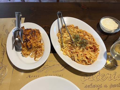 After a light breakfast, we set off to explore the waterfalls around Sarnano. The route was beautiful, but unexpectedly longer and sometimes more difficult than we had anticipated. Fortunately, we eventually arrived at the Osteria, which was like an oasis in the desert. We were warmly welcomed by the owner and were able to join the queue at 2:15 p.m. We had a delicious lunch, choosing only the pasta, all freshly made by the owner's wife. The portions were so large and tasty that we couldn't manage another dish. In hindsight, we should have shared a pasta and then ordered grilled meat. We'll keep that in mind because we'll definitely be back! After delicious cappuccinos and our water bottles refilled by the owner, we were given directions for the rest of the route and set off again with big smiles on our faces. Thank you, it...