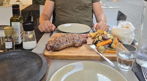 Sie haben mir extra eine heiße Grillpfanne gebracht, damit ich das Steak gut durchgaren konnte, während mein Mann sich das Steak rare gegönnt hat.