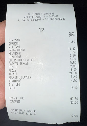 Read moreLocale molto carino e riservato, tutte le pietanze arrivate al tavolo erano buonissime e rispecchiano a pieno la tradizione culinaria sassarese, purtroppo, al momento di pagare il conto ho avuto una spiacevole esperienza che spero sia dovuta a un errore di inesperienza, il conto era di 103 euro e una volta arrivato in cassa, non avendo pezzi inferiori a 50 ho dovuto dare 150 euro, la signora non aveva cambio (inammissibile visto che eravamo il primo tavolo ad andarsene) e mi ha chiesto se potessi aiutarla ulteriormente, ma alla fine dopo qualche altro suo tentativo mi è stato detto “facciamo che me li dai la prossima volta” ( con aria sconfortata). Piccola osservazione, non pretendo che il caffè mi venga offerto, ma alcune dinamiche di vendita al cliente dovrebbero essere risapute e se il conto è di un certo tipo (eravamo in 3) solitamente si cerca di arrotondare in questi casi SPECIALMENTE se il caffè non è stato offerto e se quel cliente lo vedi spesso (3 volte in questo mese) e non essendo neanche la prima volta che succede, in quanto la volta precedente il conto per due persone è stato di 51 euro (caffè incluso). Spero che questa piccola critica possa servire in futuro perché il posto merita e perché essendo un posto di tradizione sassarese dovrebbe dare al cliente una coccola in più, queste piccole cose fanno la differenza nella memoria del cliente che ritornerà a spendere ancora più volentieri da voi, ciò nonostante do 4/5 confidando che questa recensione venga quantomeno presa in...
