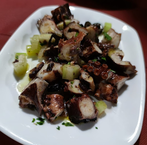 Abbiamo optato per portate senza glutine, non ci sono particolari scelte, ma gli allergeni sono ben indicati, quindi risotto e pesce. Polpo e patate: polpo tenero, patate un po' troppo frollate, nel complesso direi un po' scialbo nel gusto. Risotto per due, pesce fresco, ben "condito" ma salatissimo.. e scotto. Zuppetta di cozze, crostacei probabilmente cotti in precedenza anche qui sale più che abbondante.