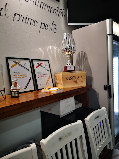 Read moreSiamo capitati qui per visitare il centro di sassari di sfuggita. Avevo letto delle recensioni e consultato il sito ufficiale della pizzeria per farmi un'idea e non mi sono sbagliata! Siamo andati io e il mio compagno alle 19.45 di un venerdì della prima setimana di settembre. Ovviamente era vuoto per via dell'ora in cui abbiamo terminato la passeggiata. La ragazza alla cassa, credo si chiami Lucia se sbaglio mi scuso, é stata molto gentile ci ha fatti accomodare, il design interno é moderno e curato, ottima scelta fare vedere la zona in cui si impasta e si cucina. Mi piacciono molto i disegni alle pareti e le citazioni di d'Annunzio. Hanno birre ricercate nel frigo verticale e diverse tipologie di pasta. Tra cui la senza glutine fatta da loro e non con basi o preparati provenienti da altrove. Per il senza glutine la pizza è tonda classica con sponde alte un po' stile napoletano per intenderci. Mentre per quella glutinosa hanno la classica, la carta da musica che consiste nel metttere la farcitura all interno della pasta pizza dando un risultato alla vista molto bello, fragrante e digeribile perché l'impasto non è affatto pesante ma pieno di aria. In alternativa ci sono la otto spicchi cioè alta e croccante stile gourmet, quella in Pala almeno x due persone. Ingredienti di qualità troverete pomodoro sardo, fiordilatte al posto della banale mozzarella da pizzeria, i pomodorini san marzano, il prosciutto di parma stagionato 30 mesi, il pecorino del luogo, la salsiccia ploaghe, bufala dop, mortadella, pistacchio di Bronte, acciughe cantabrico, purpuzza, casizzolu.. Si insomma non prodotti banali. Il pomodoro si sente assolutamente che non è di bassa categoria! Ottimo impasto senza glutine cotto in forno a parte. 2 coperti, 1 carta da musica, 1 verace senza glutine, 1 caffe, 1 acqua da 0 75L.. 27...