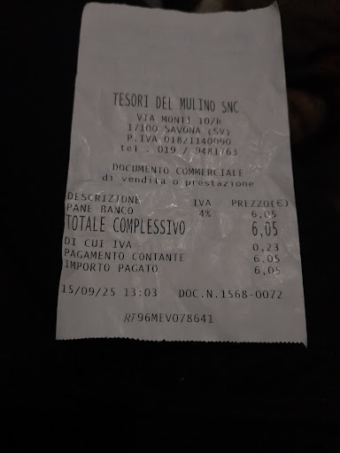 Read moreDa quando ho scoperto Tesori del Mulino non riesco più a farne a meno! La focaccia è sempre morbida e buonissima, il pane profuma come una volta e i dolci sono una tentazione continua. Si vede la passione e la cura che mettono in quello che fanno. Ogni volta che passo mi accolgono con un sorriso e la sensazione è quella di entrare in famiglia. I prezzi sono assolutamente onesti rispetto alla qualità altissima dei prodotti: vale davvero ogni centesimo. Per me è diventato un punto di riferimento a Savona,...