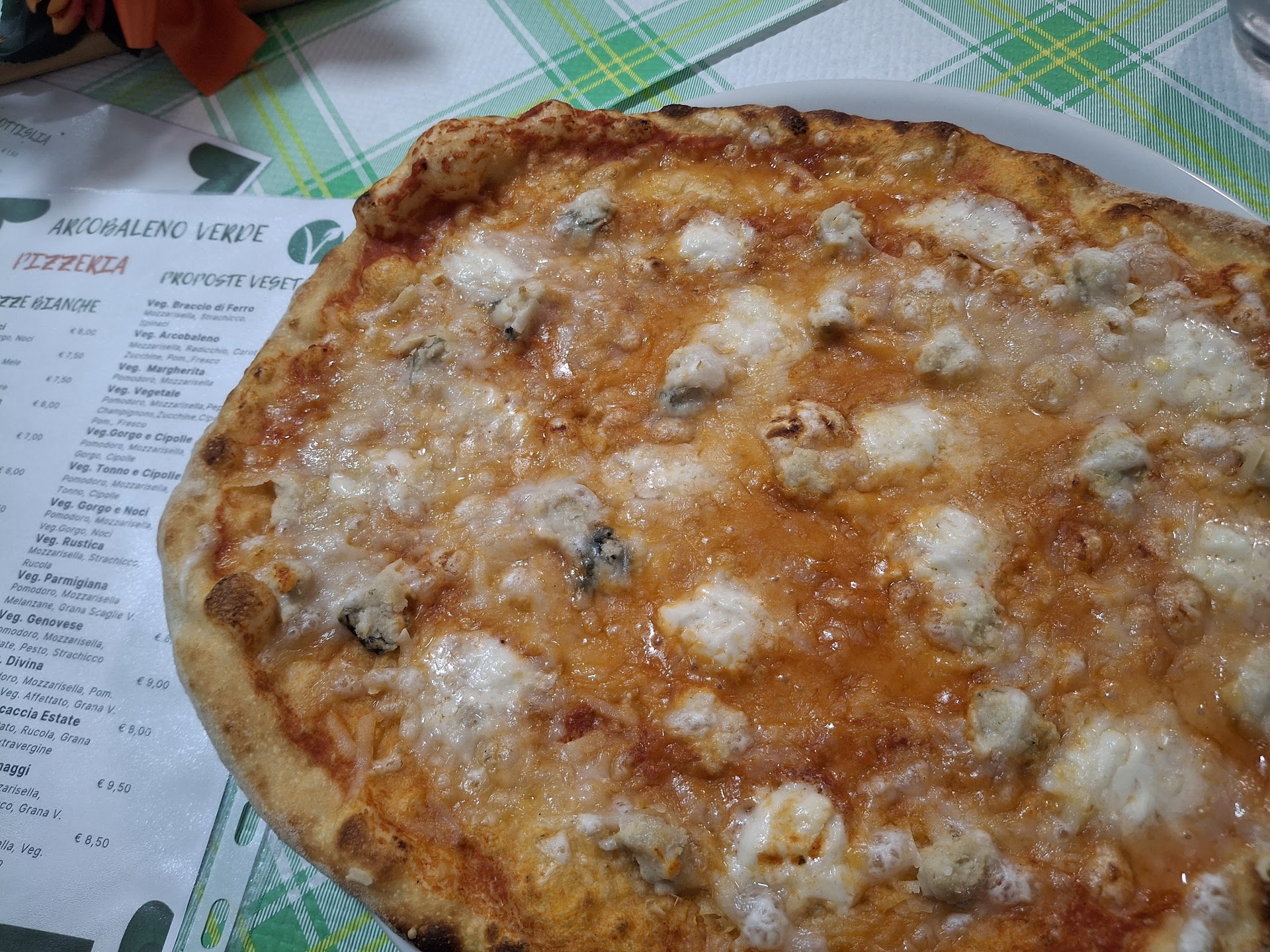 Finalmente ho provato la pizza dell' Arcobaleno Verde 💚 Che dire? Innanzitutto premetto di aver scelto questo locale per la gentilezza disponibilità e simpatia del gestore, che anche solo per telefono mi ha incuriosita e invogliata all' assaggio. Lì ho trovato un servizio cortese da parte dei ragazzi proprio come l'avevo immaginato. Veniamo al menù: vasta scelta di pizze veg che Finalmente mi hanno permesso di mangiare senza dover semplicemente togliere qualcosa. Stracchino gorgo mozzarella affettati vegetali e frutta e verdura ovviamente, a disposizione per gustare la propria cena in piena libertà. Ho scelto un impasto al carbone vegetale e la prossima volta prenderò quello ai grani antichi e acqua di mare. Hanno anche una scelta di dessert veg davvero entusiasmante che comprende crostata, crema catalana, cheesecake al cioccolato tiramisù e panna cotta. Prezzo adeguato per tutto. Se ci tornerò? È diventata la mia pizzeria preferita visto che siamo 15 in famiglia di cui solo io e mia figlia che non mangiamo carne e latte e derivati, ma qui si trova proposta veg e non. Quindi cosa desiderare di più?...