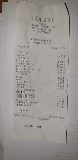Read moreTradizione e qualità! Ristorante storico della zona, in cui, paradossalmente, io e la mia famiglia non eravamo mai stati, pur essendo mezzi maremmani. Cercheremo di rimediare il tempo perduto perchè ci siamo trovati molto bene questa estate: abbiamo mangiato due volte e in entrambi i casi siamo usciti davvero soddisfatti. La marina di Scarlino è di recente costruzione ma Vittorio è uno dei pochi edifici del posto esistenti da decenni e per questo ha una atmosfera particolare e una identità tutta sua. Abbiamo cenato entrambe le volte all'aperto, con la vista sul tramonto nel porto di Scarlino ... molto piacevole. Il menu, facilmente consultabile anche on line sul loro sito, è tradizionale e presenta principalmente piatti di pesce, senza dimenticare però i clienti che preferiscono scelte di terra. Ottimi sia primi, in particolare le saporite tagliatelline alla marinara e le trofie con filetto di pesce e pistacchi, sia i secondi, soprattutto la frittura e la grigliata di mare. Molto buone anche le verdure fritte. Altro punto davvero positivo è il servizio: tutti i camerieri che ci hanno servito, da chi ci ha preso l'ordine a chi poi ci ha portato i piatti, sono stati davvero molto gentili, professionali, premurosi, attenti e disponibili. Prezzi adeguati: primi piatti di pesce sui 14€, grigliata mista a 22€ e frittura a 18€. Buona carta dei vini, con ampia varietà sia di tipologia che di prezzi. Insomma, un ottimo ristorante di tradizione, per mangiare piatti di qualità, in un ambiente molto carino, serviti da uno staff preparato e...