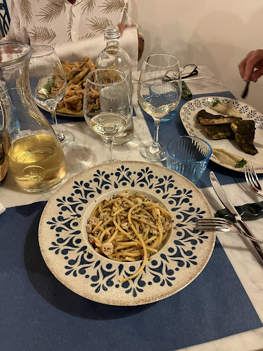 This restaurant does not disappoint, in fact, I think it exceeds the Google reviews which I read before coming. The ambience, service, and food are all fabulous. The owner graced us with olive oil which was freshly made, and it quite possibly was THE best olive oil that I have ever had, I would recommend making a reservation. We were lucky to get a table on the beautiful patio, because we showed up a couple minutes after they opened, so were very fortunate to get a table without a reservation. It was full moments after we arrived. Our first course was amazing, codfish balls, perfectly cooked… Crispy on the outside and deliciously fresh cod on the inside. We had the special of the day, a shrimp pasta, and the linguine à la Vongoli. All of the food was...