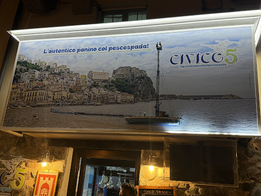 Read moreIeri sera, con amici siamo andati a provare il celeberrimo e tanto decantato panino del civico 5. Location magnifica, una terrazza sul mare di Chianalea. Arriviamo un po' tardi e non si trovano molti posti, quindi ci fanno accomodare in 5 in un tavolo da 4. Nessun problema essendo un panino un pasto non complicato da mangiare e ci possiamo adattare. Il menù non è eccessivamente ampio, presenta alcune varietà di panini con il pesce spada, altri due panini con pesci diversi e diverse tipologie di fritto. Notiamo subito che i prezzi non sono proprio economici ma li giustifichiamo per il rincaro dei prezzi e soprattutto perché si tratta di pesce. Notiamo, però, subito un prezzo essere davvero eccessivo, 2€ di coperto. Il tavolo quando ci sediamo non è apparecchiato, dopo che ci siamo seduti viene messa una tovaglia di carta, l'acqua viene portata con una torre di bicchieri di plastica in cima, i tovagliali sono quelli insopportabili da bar. Capisco il posto, ma stai offrendo un servizio da paninaro e non puoi chiedere un coperto da ristorante. Ordiniamo 5 panini con il pesce spada, una bottiglia di vino e una di acqua. I panini sono abbastanza buoni, molto croccante il pane, si sente la freschezza del pesce ed è cucinato a regola d'arte, ma molto scondito. Si vantano tanto del salmoriglio di loro produzione ma un pochino in più lo potrebbero anche mettere. Inoltre il panino è davvero piccolo. Il personale è molto gentile, anche se un po' impacciato, hanno anche dimenticato un panino, ma fortunatamente sono abbastanza veloci nella preparazione. Conto finale 104€, circa 20€ a persona, prezzo che sarebbe stato onesto se solo il panino avesse delle dimensioni normali e il servizio più attento. Sinceramente non mi sento di consigliarlo. Sono panini davvero molto semplici, che si possono preparare a casa ad un...