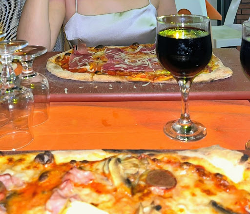 Abbiamo ordinato due pizze, e il vino della casa. Dopo un bel po' arrivano le pizze, di forma rettangolare, inutile dire che, già dall'aspetto, non mi ispirava per nulla. La pizza era piatta, era croccante, l'impasto non era fatto bene, sembrava quasi una bruschetta.