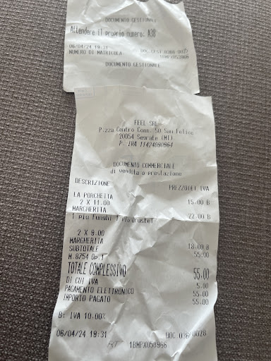 Neapolitan pizza with the classic "large frame" in San Felice. It is located in Piazza Centro Commerciale in Segrate. The location is modern but a bit anonymous, but you can understand it because it is also a Lounge Bar, therefore equipped for aperitifs (I look forward to it). The mise en place is very simple, but elegant, with an artistic touch on the choice of colored glasses for the mineral water. The raw materials used are good and the Pizza, in particular we chose three: one Neapolitan (made to perfection), one with pork sausage and the last with Speck and broccoli. All good. The prices are a little high for being outside Milan, but I will return to try the cuisine and pizza...
