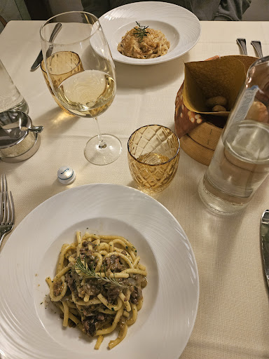 Con gli amici abbiamo già frequentato questo ristorante e ne usciamo sempre abbastanza soddisfatti. Sale da pranzo intime e ben arredate, in sintonia con le festività o le stagioni. Qui non si può non assaggiare il pasticcio di cipolla, molto delicato ma l’ultima volta un po’ “scomposto” non proprio bello morbido e giusto appena caldo…Comunque, niente vino sfuso il fine settimana, ma buona la proposta della cantina. Specialità anche il coniglio, da provare, ma presenti altri tagli di carne da diverse cotture. Poi… raccomandano l’arrivo puntuale…. Il servizio, presente (ma senza sorrisi), ma molto presente, del tipo via piatti e bicchieri (per far capire arrivati puntuali ore 20, fine cena ore 21,30-21,45…). Prezzo, un po’ sopra le aspettative, ma abbordabile, giustificato per l’ambientazione che permette libertà di parola senza alzare la voce è giusta distanza...
