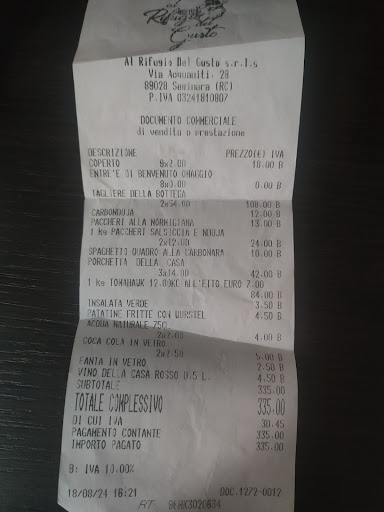 Read moreIl cibo era buono, per quello che abbiamo mangiato. Siamo arrivati alle 13:15 ed hanno servito l'antipasto alle 14 circa. Alle 14:30, vista l'abbondanza dell'antipasto, abbiamo chiesto al personale in sala se fosse stato possibile eliminare i primi piatti, se non già pronti, e passare alla carne, ma la risposta è stata che erano in preparazione. Dopo 40 minuti circa abbiamo sollecitato ancora il servizio e solo alle 15:40 hanno portato i primi piatti. A quel punto abbiamo preteso di parlare con il proprietario perché, dopo aver perso la fame e stanchi di aspettare, volevamo andare via e pagare il dovuto. Qui la situazione ha assunto i contorni di un film, il proprietario, infastidito, ha addossato la colpa del ritardo al fatto che noi clienti avevamo raggiunto il locale nello stesso momento, quindi dovevamo avere pazienza (1 ora e mezza per i primi piatti!!) e che quando abbiamo chiesto i annullare i primi, asseriva che i sughi fossero già pronti.. E la pasta? Ancora, la carne ha una certa tempistica di cottura e che era stata avviata dopo i primi piatti e che non era possibile bloccare la comanda. Ovviamente capito che interessavano solo i soldi, abbiamo chiesto il conto ed alla comunicazione che la carne era sul fuoco abbiamo risposto di darla ai bisognosi. Morale della favola uno scontrino di 335 euro, comprensivo del cibo non consumato. Dalle parole del proprietario non una parola assunzione di colpa per il ritardo, ma solo parole di colpevolezza nei confronti di noi clienti perché giunti al ristorante tutti insieme. Non ritorneremo mai più in questo ristorante. 10 Settembre. In merito alla risposta del proprietario, non c'è nulla da indagare perché il fatto è stato subito portato all'attenzione ma la risposta è stata, come già detto, che la colpa è stata di noi clienti. Noi clienti portiamo i soldi e non dico che abbiamo sempre ragione, ma in questo caso abbiamo atteso tanto per ottenere un insulto all' intelligenza. Forse era meglio non rispondere alla mia recensione. Anche qui si vede che si è allergici alle assunzioni di...