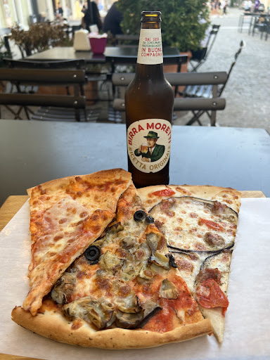 Read moreLocale piccolo ma ben curato , la pizza è ottima ben condita e digeribile , il servizio è rapido e la commessa molto gentile e professionale nel servire i clienti , il locale è al piano terra con ampia entrata quindi agevole anche per sedia a rotelle all'interno ci sono posti a sedere solo tavoli a mensola con sgabelli piuttosto alti ma per chi a problemi nel muoversi all'esterno ci sono tavoli e sedie normali con ampi ombrelloni per ripararsi dal sole , il locale si trova in centro in piena zona pedonale ma ci si arriva facilmente anche perché a poca distanza ci sono parcheggi anche custoditi , luogo adatto anche per bambini lontano dal traffico , è possibile l'asporto , lo consiglio per chi ama la buona pizza saporita e...