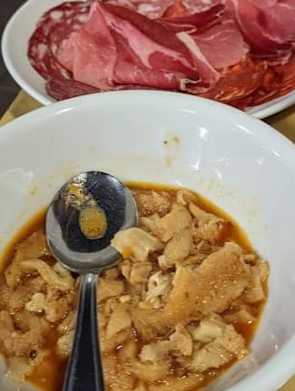 L 'antipasto della casa composto da salumi, fagioli in umido, trippa, polentina rossa al ragù, polentina bianca ai funghi.