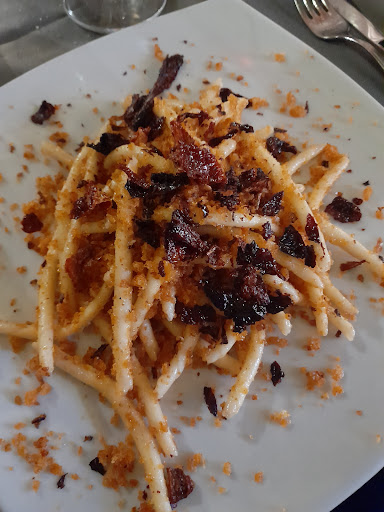 Read moreIl cibo è ottimo. I peperoni cruschi immersi nel cioccolato come dessert sono uno spettacolo e ci si lecca le dita. Però, come già scritto da altri se si paga con la carta viene aggiunto qualcosa un più per cui il conto non corrisponde a quanto consumato. A me hanno aggiunto un beverage in più di due euro di cui mi sono accorto dopo che sono andato via. Data la piccola cifra ho lasciato perdere. Può darsi pure che si è trattato di uno sbaglio. Però visto che questo sbaglio, a quanto pare, si ripete controllate bene il conto finale se pagate con la carta. Prezzi oggettivamente più alti della media, però il livello del cibo è anch'esso più elevato. Un primo, un secondo, un quarto di vino sfuso e una bottiglia d'acqua, presumo di rubinetto, e una porzione di peperoni cruschi al cioccolato 45 euro in due. Però attenzione, non un primo e un secondo a persona ma un primo e un secondo divisi in due. Idem per la...
