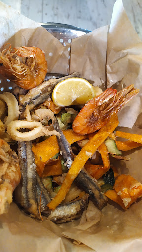 Cucina:7/5* se potessi darei più del massimo. Vastissima scelta di piatti :dalle tapas di pesce, ai panini primi e secondi, e inoltre le Bowl... C'è solo l'imbarazzo della scelta e tutto buonissimo. Noi abbiamo mangiato paccheri al ragù di polpo (sublimi) e risotto ai frutti di mare (delizioso) e una frittura di pesce in due (foto) (molto abbondante, croccante, e davvero molto buona) vino (della casa) caffè e limoncello (offerto). Era davvero tutto ottimo. Ho apprezzato moltissimo la ciotola per gli scarti.