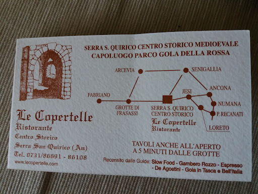 Read moreFinding myself in Serra San Quirico, I decided to eat,for lunch, at Le Copertelle, the only restaurant in the historic center of the town. Traditional cuisine, without too many designs on the plate, presented simply. Everything is tasteful, without too many frills, like the service: essential, and with a perpetual smile, plastered on her face. Interesting wine list. Worth mentioning, that I had not reserved, finding a seat easily: instead they were full, with two groups... even. The owner, friendly and attentive, gave me the last available...