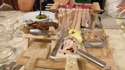 Serrastretta, paese incastonato in una verdissima vallata nella parte meridionale della Sila, si colloca sulla strada che collega Catanzaro e Rogliano, itinerario alternativo (disponendo di tempo) all'ampia ansa tra lo Jonio ed il Tirreno che la Salerno - Reggio Calabria disegna in questo tratto del suo percorso. Nell'osteria, che si trova nel bosco a poca distanza dall'abitato, sarete accolti nel modo più cordiale dal titolare e dal responsabile della sala, che si alternano nell'offrire un'attentissima ma discreta assistenza ai tavoli, illustrando tutte le portate e la provenienza dei relativi ingredienti, tutti di qualità eccellente e per lo più prodotti in proprio. Come spesso accade in Calabria, non siamo riusciti ad andare oltre il ricco antipasto "sulla tavolozza", che propone crostini, salumi, formaggi, verdure cucinate in vario modo (caponata, ceci nel coccio, purea di fagioli del Reventino, involtini di melanzane, olive piccanti) ed altre delizie (pera con crema di formaggio, more di gelso all'aceto balsamico). La carta riporta anche primi e secondi piatti estremamente invitanti, a base di funghi, carni ed altro ancora, che speriamo di assaggiare alla prossima occasione. Per dessert abbiamo scelto due superlative "cremolate" (granite), una (strepitosa) all'arancio, vaniglia e menta e l'altra alle fragole di bosco e vino rosso. Buon vino della casa sfuso, conto più che onesto. Prima di ripartire, il responsabile dei tavoli ci ha proposto l'assaggio di uno degli infusi alcolici da loro stessi prodotti utilizzando le erbe selvatiche che crescono nel bosco...
