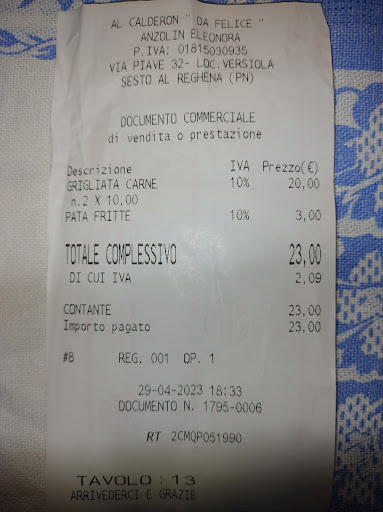 Read moreLocale sito nella piccola frazione di Versiola di Sesto al Reghena, in provincia di Pordenone, dove la pace della natura e l'atmosfera famigliare e calda del locale, la danno da padroni. Il locale a gestione famigliare si contraddistingue per piatti di ottima qualità per gusto e freschezza. Dal pesce, alla carne, ai primi e secondi piatti ai menù fissi del mezzogiorno... insomma non c'è che da provare. Personalmente non c'è stata occasione che sia uscito dal locale insoddisfatto....