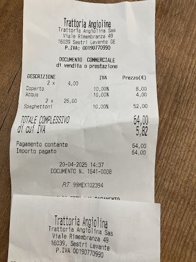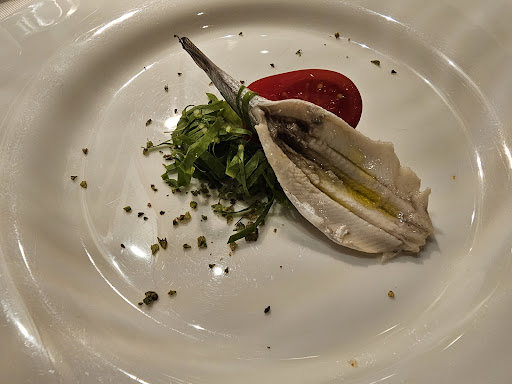 Read moreAngiolina è un bel ristorante all'inizio del carrugio, su una piazza aperta che riesce a disperdere anche il caos e il caldo delle serate agostane. E se si ha fortuna si può vedere anche lo scorcio della Baia del silenzio. Anche gli arredi, in stile marinaro ma elegante, sono gradevoli e curati, con le riproduzioni di foto d'epoca che ricordano la storia secolare del locale. È per questo però che mi aspettavo molto di più, a partire dal servizio (bottiglie vuote lasciate sul tavolo, camerieri che servono prima gli uomini passando i piatti davanti al naso dei commensali ecc) e soprattutto dalle pietanze. Il piatto di benvenuto è una (una!) acciuga al limone e viene servito solo con la forchetta costringendo a mangiare in un boccone il pesciolino coda compresa. Il mio antipasto di gamberi e zucchine a quasi 30 euro era da pizzeria. Meglio il cappon magro (che comunque era quasi tutto di carote con 1 scampo decorativo) e il dessert. Ma i prezzi non sono giustificati. Purtroppo anche ristoranti storici di Sestri Levante che dovrebbero tenere alta l'identità e la cultura del borgo finiscono per essere...