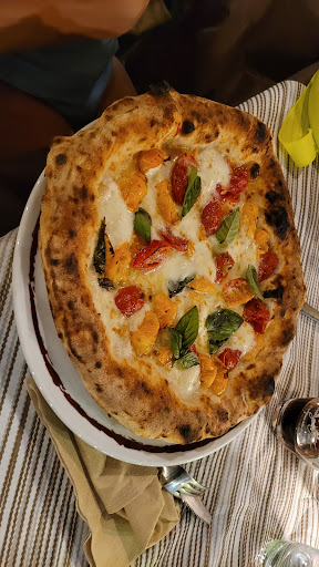 Iniziamo col dire che la pizza é davvero buona, digeribile e preparata con ingredienti di primissima qualità, si sente che c'è tanta tecnica e maestria nella preparazione e cottura! Noi abbiamo mangiato fuori tuttavia era una serata molto ventosa e questo ha un po compromesso la nostra esperienza. Non é certo colpa della pizzeria tuttavia ci saremmo aspettati la possibilità di poter cenare all'interno cosa che all'inizio ci é stata negata seppure l'interno era vuoto probabilmente per ottimizzare il servizio. Quando il vento si é fatto davvero forte ed i piatti volavano letteralmente via dai tavoli allora hanno iniziato a far spostare i clienti all'interno peccato che noi avevamo ormai finito. Sicuramente c'é da fare un po più di attenzione a questi aspetti perché fanno parte della "esperienza del cliente". A parte questo abbiamo mangiato una pizza eccellente e dei fritti ottimi inoltre il personale é sempre stato all'altezza del servizio.