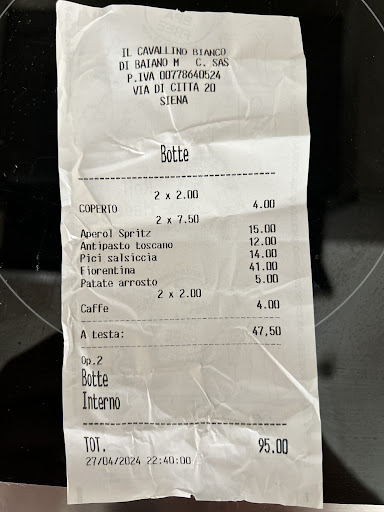 Read moreDinner for two. Place is very calm, perfect for a relaxed dinner after visiting Siena. Staff is very friendly and polite. We had the Siena Salame Slices as starter (highly recommend) and the pici pasta and the T-Bone as the main course. The pasta was delicious. The T-Bone had a great taste but was very harsh to cut through and difficult to eat. A significant part of the meat was left on the plate as it had a lot of...