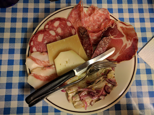 We sat outside on our visit and the menu was handwritten on the wall. They had Baccala (an Italian fish) with fresh vegetables, spaghetti with ragu sauce, or a mushroom (funghi) soup as well as an appetizer platter with selected meats and cheeses. We had the Baccala and spaghetti. They were both very delicious and filing. We shared a 0.5 L carafe of house wine and a bottle of water. I can't complain about any of it. I can't remember if this place charges a coperta (cover charge) of 2 euro per person. I would just ask before sitting...