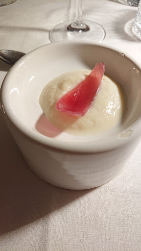 Wie alle Speisen wird mit einem Gruß aus der Küche gestartet. Dieser variiert täglich. Von einer Variation vom Thunfisch-Tartar mit Orangenstücken, sehr interessant, zum Blumenkohl-Püree mit eingelegter Zwiebel.