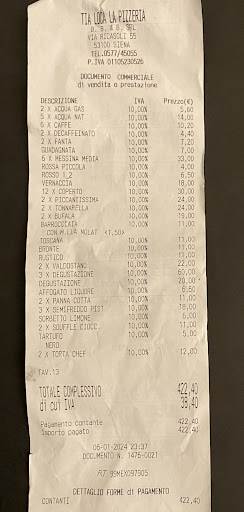 Read morePremetto che è un locale che frequento da anni ed essendo di Siena ci porto spesso gruppi di amici anche da fuori perché l’ambiente è carino, il servizio veloce ed il cibo molto buono. Era da qualche mese che non ci tornavo ma ieri sera non sono rimasto affatto contento. E non parlo della qualità, sempre all’altezza (infatti ho dato 4* a tutte e tre le voci di dettaglio) ma dell’intenzione di voler guadagnare sulle portate di accompagnamento. 2.80 € per una bottiglia d’acqua (nemmeno sigillata ma riempita dal distributore ad osmosi), 1.70 € per un caffè e 2.20 € per un decaffeinato!! Nemmeno a Piazza S. Marco! E la cosa che mi è dispiaciuta di più è che alla fine della cena (422.40 € in 12 persone in cui alla ragazza che ha fatto il conto non è venuto neppure in mente di togliere i 20 centesimi dalla quota di 35.20 per far ripartire le quote più comodamente) tutti i miei amici siano rimasti delusi dal prezzo. La qualità giustamente si paga, ma il costo più alto è giustificato solo per gli ingredienti in cui si può fare la differenza, non su acqua e caffè! Finché lo fate con i turisti che poi non rivedrete, vi può anche tornare vantaggioso, ma con le persone del posto non mi pare una grande...