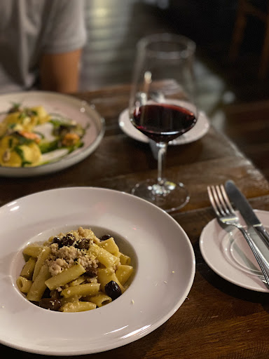 We ordered terrine in Vin Santo with brioche which tasted ok, but the combination of it was.. let's say, dry. Maybe because the brioche bread was slightly overtoasted. Then I had rigatoni with rabbit's meat in white sauce, which turned out to be a simple pasta with steamed minced meat and a few black olives. Didn't understand this combination as well... Maybe I took the wrong dishes? But should they be in the menu overall? I was very hungry, but I couldn't even finish my pasta... Can't tell much about my friend's food since I didn't taste it. But he had a mini portion of ravioli and didn't understand the green sauce combination with them.
