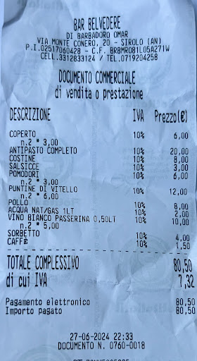 Read moreConosco e frequento questo posto dai suoi albori, posto meraviglioso e vista unica che tutte le volte lascia senza fiato. Questo panorama però non giustifica più i prezzi a mio avviso esagerati, senza nulla togliere alla qualità e alla bontà della carne sapientemente grigliata, però credo che 31€ per UNA (1) grigliata dove il prezzo viene calcolato sui tagli/pezzi proposti (vedi scontrino in foto) per me sia eccessivo come d’altronde i 20€ per UNO (1)antipasto (completo) ma che alla fine presentava due fettine di mortadella 4 di ciauscolo 4 di salame Milano 2 di prosciutto e 2 fettine di formaggio pecorino. Se avessimo preso due antipasti e 2 grigliate il prezzo sarebbe salito a quanto ? Spazio bellissimo per fare cene in famiglia e con amici, ma probabilmente per le mie tasche e per quanto consumato la prossima volta mi limito come tanti ad una birra fresca ed un panino, tanto il panorama è...