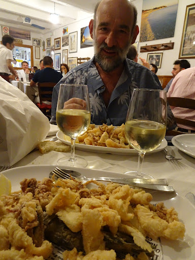 Che dire, è stata una vera delusione! saranno state le alte aspettative la citazione sulla guida lonely planet ma è stata un'esperienza deludente. Locale sempre pieno (caratteristico ma in cui bisogna scendere una scaletta e ricambio aria con pale, comunque non faceva caldo-giugno), abbiamo provato tre volte e siamo riusciti a mangiare solo prenotando un giorno prima, ma questo può essere normale, e prometteva bene. Servizio cortese ma distaccato, frettoloso e poco chiaro: praticamente la richiesta di consigli o informazioni non è servita, quindi ci buttiamo su un classico "Paranza" e vino bianco della casa, o meglio "frittura di paranza e calamari" con l'idea che se piace si prende altro, ero curioso degli gnocchi allo stoccafisso ma non ho capito cosa mi diceva il cameriere (forse che dipende se piace). Pane da "supermercato"(messo a fette in una busta di carta abbastanza ingombrante sul tavolo), vino della casa buono ma servito coperto con dei sacchetti scuri copri bottiglia per mantenere il freddo che non ho mai sopportato. Fritto direi in prevalenza calamari il poco pesce presente sembrava fresco e buono, nell'insieme però, rispetto alla media, lascia una sensazione di unto non piacevole al palato. Mentre mangiavamo il cameriere ci ha messo sul tavolo due salviettine per pulirsi le mani e ci siamo chiesti se fosse un invito a finire o una gentilezza fatta nel momento sbagliato: in genere si porta a fine portata o a fine pasto con il conto. In breve per essere un "osteria" di pesce in un luogo di mare mi sembra non abbia ancora chiara la sua "vocazione", ottimo avere un numero limitato di portate per garantire qualità ma servizio (3 euro), qualità e informazioni poi devono essere coerenti: bruttissima la nota a fine menu sul possibile uso di surgelati in mancanza di prodotti freschi, meglio semplicemente non proporla quando non ci sono prodotti freschi. A vista gli antipasti/piatti che passavano non ci hanno ispirato ne attratto. Non convinti ne soddisfatti non abbiamo ordinato altro (circa 60 euro in tutto): ripeto giudizio di un'unica esperienza ma non posso consigliarlo. Grazie lo stesso: la prenotazione via mail è stata gentile...