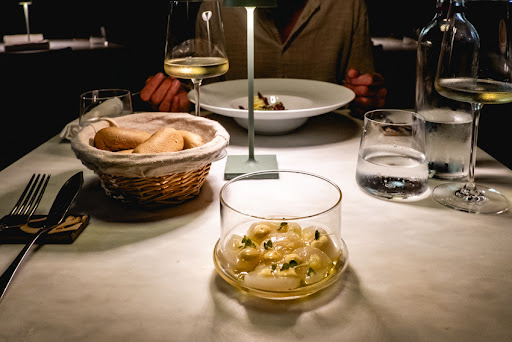 Read moreAfter so many 5 star reviews, I think the restaurant needs a reality check. we took the tasting menu 50eu pp - tiny portions. Bread was an absolute shame, worst one weâve encountered in Italy: certainly prebaked, bought in from Lidl (or similar). amusebouche Fried Squid: dry, lukewarm, certainly fried long before service, mayonnaise was nice. Antipasti: Tripe of monkfish in sugo, lukewarm - i liked the texture. Primipiatti 5 pieces of filled pasta with codfish filling and caramelized onion sauce - tasted like factorymade, dont think it was fresh pasta. Secondi: 3 small pieces of fried monkfish with lime mayo: mayo was ok, fish unremarkable- at least it was fried to order. We were still hungry at this point, and ordered the Amberjack maincourse to share: served with potato duaphinoise and beurreblanc cream, greenbeans. Fish was ok, could use a crispy skin. Potatoes scalding in the middle, certainly microwaved. Greenbeans were rather gray, overcooked. Then came a plate of stale cookies as dessert, unedible. Upon our remark, we were brought a warm apricot cake with saffron icecream; tasty, best course of the meal. 4 glasses of âokâ wine. Water glasses smelled of âeggâ, sign of inattentive dishwashing. 150eu total, IMO way overpriced. The restaurant has a young staff, nice atmosphere and good potential- hope they fix the food: as it is, i would call it a tourist trap. We had high expectations for this price....