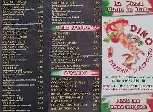 Read moreLa pizzeria d'asporto di Dino è un vero gioiello per gli amanti della pizza. La qualità della pizza è eccellente, e il rapporto qualità-prezzo è davvero ottimo. Ciò che colpisce di più è la velocità del servizio; Dino e il suo team si assicurano che la tua pizza sia pronta in un batter d'occhio.
