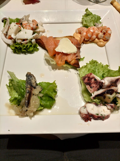 We had dinner in this place to celebrate our anniversary and when you first get in, it looks very cosy and elegant. We called to book because we had a little dog with us but was on Monday night and the owner said we could go in and it gave us a really nice hidden table. ||We had a starter such the choice of the chef, which includes creamed (but too much cream) salt cod, king prawns with too much oil, very good crispy grilled octopus, a too oily scallop, quite interesting taste and good shrimp cocktail, good shrimps with vegetables and a tasty crusty bread with smoked salmon and butter.||For main course we had a seabass which was not well boned and a bit too dry, then we had grilled squid which were really good and I recommend.||Both were served with a mix of grilled mushroom stump, cold potatoes, oven baked cold potatoes, grilled radicchio and (lot of) butter spinach, all with too much oil which we left half there.||Anyway we pay and left without taking any dessert as we were disgusted from the oily taste in...