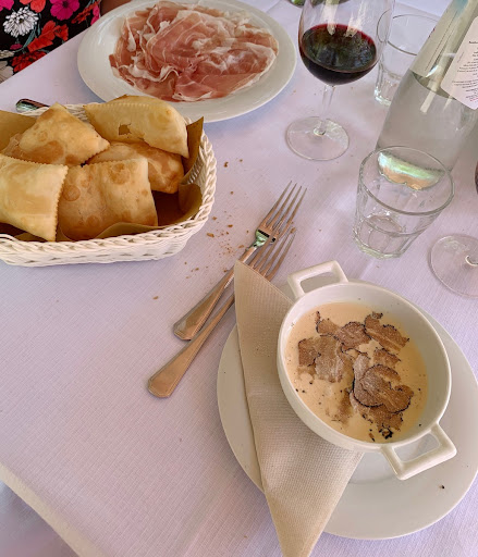 Avevo voglia di un ritorno alle mie origini...avevo voglia di quei gusti che il mio palato pratica poco.. Ho una societá di catering e dei locali nella Riviera di Levante in Liguria, quindi riconosco il mood, la materia prima, qualitá, capacitá, serietá e se c'é lo starter che spinge a fare un mestiere difficile come il ristoratore in chi per una sera mi fa fare la cliente... Le mie papille gustative hanno fatto la ôla con i salumi misti e uno gnocco fritto perfetto, si sono commosse con gli anolini in brodo...e via dicendo. Idem la persona che era con me a cena...l'uovo al tartufo in crosta? Parliamone. Ottima cantina, mi soffermo sui prezzi, oso dire bassi soprattutto per la qualitá della materia primaofferta...bassi per la bellezza del luogo, delle stoviglie...bassi perché nn ci sono abituata a vedere i tortelli a 11 €... Veniamo al servizio...la ciliegina su una torta buonissima che trasmette amore. Brave!!!!!🍾🥂 brave davvero e...
