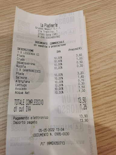 Read moreA parte il dover per forza pagare col bancomat perchè in cassa non c' era resto in contanti, vabè.. da cliente pago 17€ per un rotolo dove all' interno il prosciutto crudo (e chi ha lavorato mezza volta in ristorazione lo sa..) scaldato, praticamente cotto ..e la seconda piada che era praticamente vuota, ho mangiato solo impasto, una cosa buona c' era ..l' estathè al limone, che date via comunque ad uno sproposito. Questo probabilmente non è tutta colpa dell' addetto di turno perchè c' è da fare una premessa, in più punti vendita di questo franchise ho riscontrato che la maggior parte delle volte gli addetti non sono formati e del tutto competenti e non sono mai gli stessi, o che nelle piadine mancano ingredienti senza che pero venga comunicato, equivale a prendere in giro la gente, questo vuol dire solo una cosa, che c' è troppo ricambio, i...