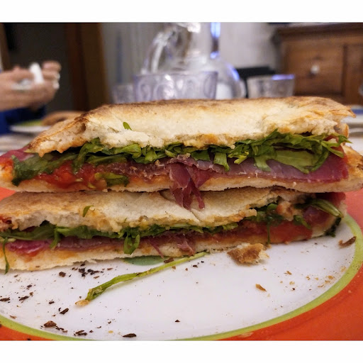Pizza panino: strepitosa! Impasto veramente molto buono e saporito! Si arriva in fondo alla pizza/panino pieni e soddisfatti! Si sono proprio rifatto rispetto alla prima volta che provai la pizza qui. Ammetto che due anni fa sbagliai la scelta: presi la pizza al taglio, quando tutti mi consigliavano la pizza tonda in questo posto, infatti scrissi nella recensione: "Pessima pizza al taglio: pesante, unta e gommosa. La pizza tonda non so come sia". Bhe...dopo l'assaggio di sta sera posso dire che invece pizze tonde e pizza-panino...