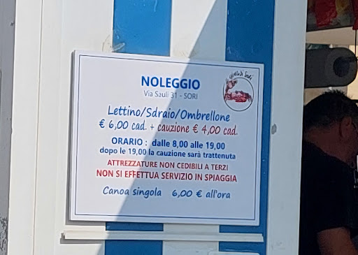 Torta di riso finita. Quando si sbaglia a fare turisti a,casa nostra. Ore 14 noleggiamo lettino in spiaggia a Sori da il chiosco. 5 euro + 3 di cauzione. Contatto frettolo (girati a,metà schiena dal bancone, avevano d fare) . Ci portiamo da soli il lettino in una spiaggia affollata. Arriva il bagnino solo per dirci dove non possiamo andare, mai che arrivi un consiglio Positivo!. Alle 19.15 torniamo dopo una passeggiata e - Lettini spariti! - scopriamo che li hanno ritirati perché il servizio era fino alle 19.(c'era scritto sul cartello ) Quindi , raccattate le nostre cose buttate sulla sabbia torniamo al chiosco e chiediamo la cauzione dato che non li abbiamo né danneggiati né tantomeno rubati. Morale: ce la negano dicendo che dopo le 19 la cauzione non la restituiscono.(?!) Ora, fatto salvo che non c'era scritto sul cartello, ma solo un post it a mano sbiadito e illeggibile sotto, sembra normale che si siano rifiutati con 15 min di ritardo?? Ignobile comportamento che credo anche illegale. Avremmo dovuto chiamare i vigili. Per 3 euro si sono fatti una reputazione pessima, questo lo stile diffuso "turismo in liguria" Peraltro con la spiaggia...