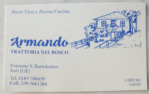 Read moreQuesta caratteristica trattoria dell'immediato entroterra ligure è conosciuta anche come 'Armando nel Bosco', e mai nome fu più azzeccato, vista la splendida posizione in cui è situata, immersa nel verde delle colline di san Bartolomeo di Sori. D'estate è decisamente gradevole pranzare o cenare all'aperto, ma anche d'inverno il posto rimane caratteristico e val la pena fargli visita. Qui si possono gustare discreti antipasti, a cui è consigliabile associare qualche focaccina con lo stracchino, una gustosissima specialità del luogo (che però è possibile prendere anche come secondo), ma i punti di forza di questa trattoria sono i primi a base di pesto ed i pansoti al sugo di noci. Pesto e sugo di noci ancora vengono prodotti come un tempo, tra l'altro utilizzando il mortaio al posto del frullatore, il che fa un'enorme differenza. Riguardo ai secondi piatti sia l'asado, sia lo stoccafisso accomodato, sia il coniglio alla ligure, valgono la pena di essere provati. Dolci non particolarmente degni di nota ma comunque sfiziosi, in particolare il tiramisù. Si pecca un po' nella scelta dei vini. Diciamo che qualche bottiglia di media qualità in più permetterebbe di gustare meglio le varie portate. Come spesa siamo in linea con le altre trattorie...