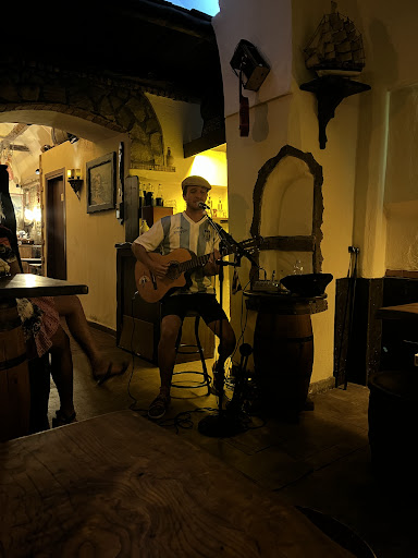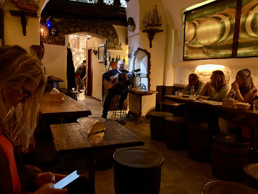 We were handed a card for this establishment by a gentleman seated in front of the restaurant who mentioned "international guitarist, fine food & wine". We were keen to experience live music so we returned for dinner. The "international guitarist" played a selection of cheesy tunes which involved audience members singing along. My preference was for the odd occasion when he simply played a normal song. There was a small charge on the bill for the live entertainment. The wine list had precisely 2 choices for bottled red wine: the smallest wine list I have encountered anywhere in Italy! Food choices were fairly simple. Everyone is crammed into the back of the restaurant. Stools are uncomfortable to sit on. If you're lucky, you will get to sit on a barrel or a bench. I was underwhelmed by the experience. Definitely one...