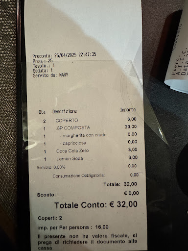 We ordered the Diavola and Capricciosa pizzas. The dough itself was excellent — light and well-prepared — but the overall pizzas were a bit too oily for our taste. We preferred the Diavola, though the spicy salami slices were cut a bit too thick, which threw off the balance of flavors.