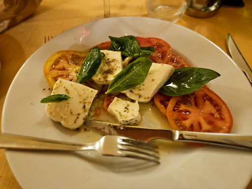 We read about this place and it was called non-touristy, which was exactly the opposite of the vibe we experienced there. I'm not saying that's a terrible thing, but it is just a reality, so choose accordingly depending on what you're looking for. Despite the availability of outdoor seating, we ate inside. The indoor atmosphere was nice enough, but bright. The service was unlike anything I've experienced. I'm guessing it's done for efficiency. We had a different waiter seat us, take our order, bring our drinks, bring our first course, bring our second course, bring the check. Literally, a different person each time. The food was quite good, but it was the most expensive restaurant we went to in our 10 days in Italy. I started with the insalata caprese, which was quite tasty because the ingredients were so fresh, and my husband had grilled mixed vegetables, which he really enjoyed. For the main course my husband had pasta with shrimp and zucchini in a cream sauce, which he loved. I had a grilled whole sea bass, which I really enjoyed a lot. The waiter presented the whole raw fish to me before he brought it to the kitchen to cook - nice touch. The service, despite the have-the-next-waiter-take-care-of-the-next-thing approach, was actually on the slow side. I was going to order dessert but it took so long for a waiter to come around that we just asked for the check. I'm very familiar with Italian approach to meals (lived here for 4 years), and how it can be relaxed and long, but this was too long to wait to ask for dessert. All in all it's a mixed experience. I keep telling myself that the food was really good, but for some reason the experience comes up a little short for me. Check it out for the food, but be open minded as to the...