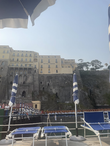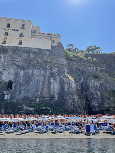 Read moreThe beach area is great but why not a 5star you'll see at the end. As the beaches go they worked out a problem and made it into a great beach area. As far as a normal UK beach goes they have got the natural lovely beaches we have. BUT they have really hot weather, lovely sunshine, water temperature like a lovely bath at home, a safe organised swimming area in the sea with boulders making an almost pool like area. The food shack is full on you can get service to your place on the beach and pay by card. They have chalet type huts for you to change in. There's a tap and shower area as you leave the beach. It is a rather close quarters beach when it get full but always plenty of room in the sea. The beach is about 50 to a 100 foot down sheer drop from the above roads and paths but there's a lift nice clean fully operable safe lift 1euro each ish. So you'll have a great beach time and there are lots of beach sectioned areas to choose from I guess there much the same. BUT THEY'RE VERY EXPENSIVE two loungers and a brolly £40 QUID with no take your own option but then your in sorrento so you must have the cash eh.! You can get away with one sunlouger at the back no brolly for £17 if your there early and push not for it cheap. Its a great day so get there early plan for the whole day and get your moneys worth once you get over the the body's hock prices you'll be fine. Oh the sand is like lava black sand and in sun is red hot the sea is warm after initial tiny oh that's cold it's isn't. If your early they leave all people's cast off goggles snorkels balls lilos crocodiles etc under the walkway at the back my son borrowed a snorkel set was in the sea most of day from nine till three and you can see a good few fish swimming in the sea below you they only little but plenty arno D...