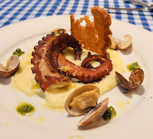 The other dish was the Risotto Mó Mó, a fried risotto akin to the "cuoppo" street-food popular in the area, served alongside local seafood and burrata. In general, my understanding is that Italian cuisine keeps cheese and seafood separate, and this dish helped me understand why. Even though the burrata was subtle enough not to overpower the seafood and risotto, they felt like two separate things occurring on the same plate. Having said this, the seafood was exemplary and the fried risotto a welcome twist.