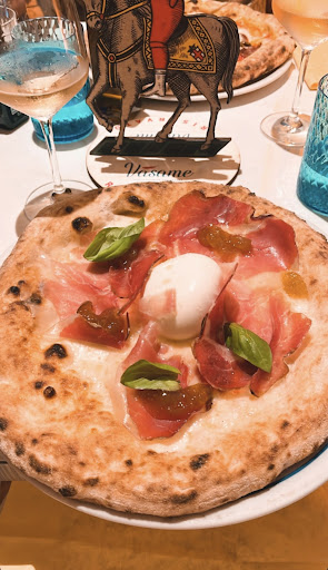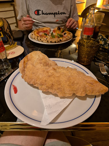 Read more"Sopravvalutata" ed anche molto. Ci siamo trovati a passare davanti la pizzeria ed incuriositi abbiamo deciso di provare come facessero la pizza. Cominciamo con l'accoglienza, non avevamo prenotato, ci ha accolto il ragazzo della cassa e mentre controllava se ci fosse posto per noi, altre due persone ci hanno chiesto se volevamo sederci, si comincia a delineare la disorganizzazione nel servizio che poi si è confermata per tutta la serata. L'accoglienza va fatta da una sola persona non da tre in modo disordinato. In ogni modo ci hanno fatto accomodare in due minuti, ci hanno portato i menù ed abbiamo cominciato a leggere, nemmeno tre minuti è arrivata di nuovo la cameriera per prendere l'ordine, stavamo ancora scegliendo e soprattutto cercavamo di parlare tra di noi ma era impossibile visto il volume così alto della musica. Il locale è carino, mio gusto personale lo trovo pacchiano, si saranno spesi anche parecchi soldi ma si è risparmiato sulla qualità dell'audio, la cassa che avevamo vicino distorceva di parecchio quindi oltre ad essere insopportabile la musica era anche inascoltabile. Riusciamo a consultarci per la scelta delle cose da ordinare e guarda un poco la pizza che volevo io non era disponibile e non ci era nemmeno stato detto. In un locale di " classe" si palesa subito cosa non è disponibile a menù. Ad ogni modo vengo invitato a scegliere una pizza fritta ed accetto. Finalmente ci viene portata l'acqua e dopo poco arrivano le chips e la frittatina di pasta. A portarcele è ancora un'altra persona che aggirandosi tra lo spazio risicato dei tavoli ci ha anche chiesto se erano le nostre. Le patatine erano discrete, la frittatina alla nerano buona, ma forse se avesse avuto meno besciamella e fosse stata più calda sarebbe perfetta, in ogni caso non valeva 10 euro e le patatine non valevano 6 euro, peraltro non hanno portato e non hanno chiesto se volessimo salse. Ci sparecchiano e nel rimettere le posate, la stessa cameriera della comanda, le lascia quasi distrattamente sul tavolo senza nemmeno un tovagliolo. Arrivano le pizze e le porta ancora un altra persona e li allora abbiamo la certezza che vige l'anarchia del servizio, ogni tavolo è di tutti, non ci sono ranghi, non c'è un responsabile di sala e ognuno si autogestisce. Le pizze erano buone in linea con le altre pizzerie di sorrento, la mia pizza fritta era poco più che tiepida, forse allo chef non piacciono le cose calde, mancava di pepe e si sentiva solo il pomodoro. È sicuramente da migliorare. Ci viene a sparecchiare la stessa persona che ci ha portato le pizze e chiediamo il conto, tempo un minuto ritorna la cameriera della comanda e ci chiede se vogliamo altro, ridiciamo che abbiamo chiesto il conto ed ancora una terza persona ci porta il conto, dimenticavo l'anarchia del servizio. Ho notato anche che la stessa persona che ci ha portato antipasto e conto, ha preso la comanda al tavolo di fronte e come successo a noi non conosceva il numero del tavolo, ha dovuto chiedere agli ospiti e nel compilare la comanda ha scritto tavolo 7 invece che tavolo 17 mandando in confusione il servizio, le pizze sono arrivate al tavolo 7, ritornate indietro e poi arrivate al tavolo 17 finalmente. Non conosce, quindi, non sa usare, peggio, i sistemi informatici del locale. In ogni caso, il conto è in linea con sorrento anche se pagare 4 euro per l'acqua e 4 euro per delle bottigline di coca mi sembra esagerato, come sembra esagerato pagare 3 euro un coperto per avere un servizio scadente al limite dell'imbarazzante e della musica altissima e distorta. Conclusioni, c'è molto da migliorare, il servizio ed il personale è da formare dall'ABC, lo stile del locale è un gusto personale e come dicevo lo trovo pacchiano. I tavoli sono posizionati male in alcuni punti e c'è da rivedere l'impianto audio o quantomeno scegliere persone competenti nel bilanciare soprattutto il volume. Sarebbe anche bello poter vedere lo chef fare le pizze che lui ha inventato e non vederlo andare su e giù una serata intera portando bicchieri, dolci o incendiando cocktail. Locale...