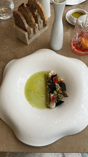 Our two-person dinner was immediately of to a great start with a piece of homemade bread and a "butter" of cinta senese lardo with rosemary. The appetiser was followed by three of amuses bouche that were laid out in front of us. The atmosphere in the restaurant is modern and open, and the service is friendly, pleasant and welcoming.