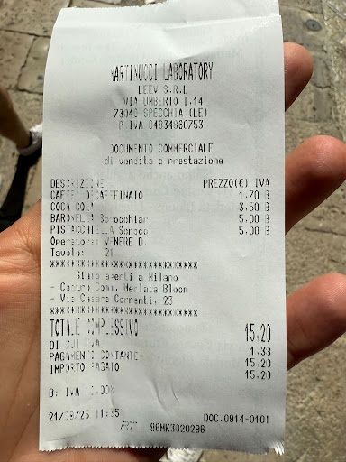 Read moreI came here this evening for an "aperitivo" with friends. The town, the weather, the ambiance, were perfect tonight, so we expected a fine service at the famous Martinucci. We asked for a bottle of Rosato but there wasn't any. This was a first blow to our expectations because Salento is renowned for rosato wine. In the end we ordered a bottle of white wine and the waiter brought us a bottle of Bombino, not bad at all. The wine and the food came along, with fine "rustici" and other nice appetizers. But we were seven of us and another bottle was needed. We asked for another bottle of the wine we ordered but the waitress brought us a bottle of a different wine without any explanation. When we asked why the difference, she told us that the wine was the same with a different bottle. The wine was different (a blend of Fiano and Greco) and undoubtedly worst. The bottle was also old, with sediments on the bottom... We can't say that the overall service was bad. The food was ok and the first bottle was fine. The price was ok too. But the question is: why a bar with a famous name doesn't have a full choice of local wines on a sunday evening? This is difficult to...