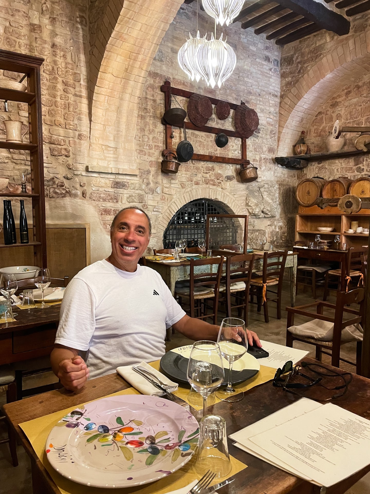 What a gem in the heart of Spello! The restaurant is set inside a rustic stone cellar with beautiful arches that immediately catch your eye – it feels like dining inside history. The unique ceramics from Domiziani, which you can also find in their shop just a few steps away, add an extra touch of character and colour to the tables.