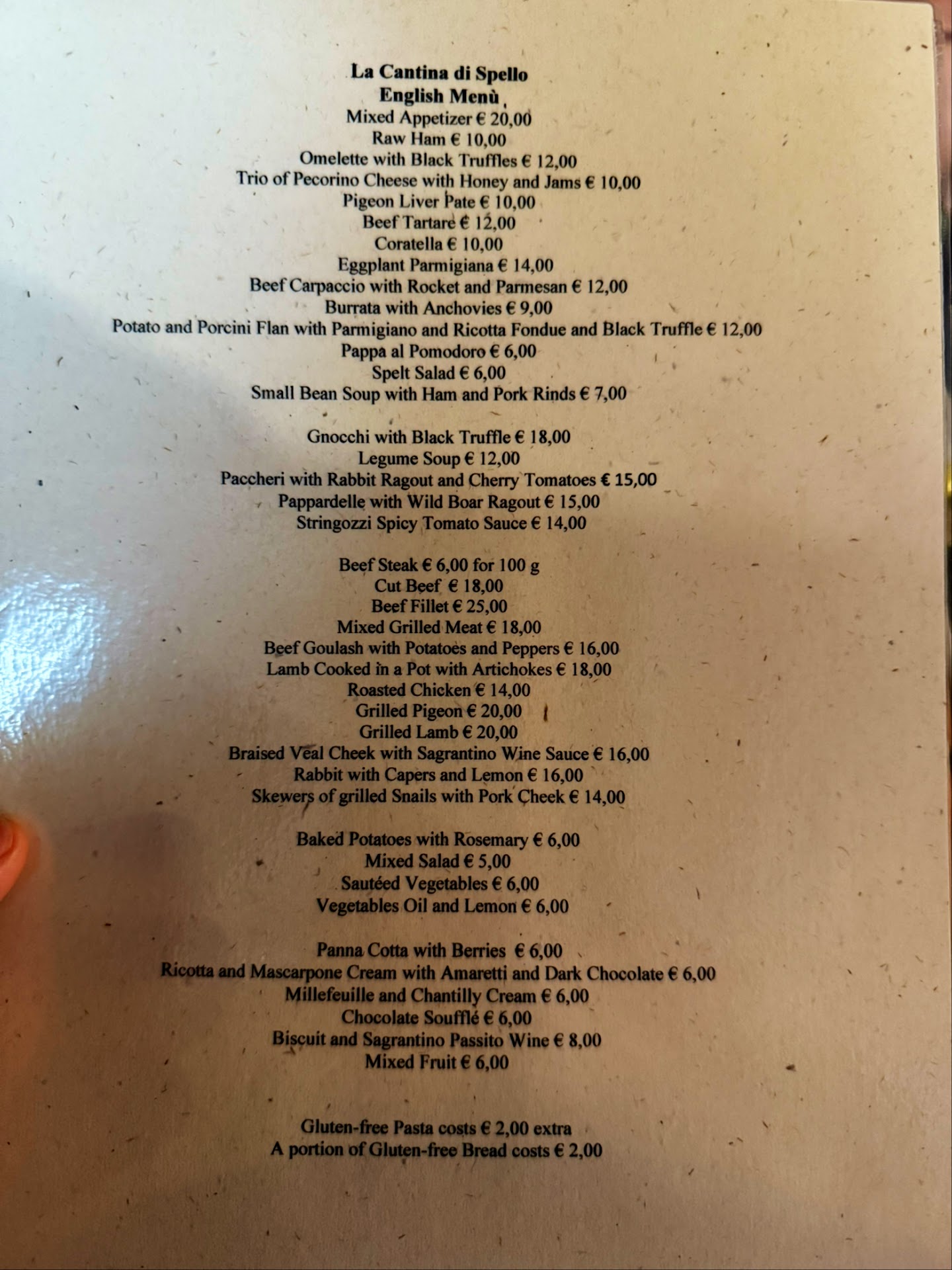 Read moreIn our experience La Cantina was the best of the 6 other very good places that we ate at in Spello during our one week stay. When we arrived we were lucky to get a table on a Saturday night. We waited for a few minutes, and they made sure we were good while waiting with glasses of Prosecco. The staff was exceptionally friendly, especially the man who I assume was the boss or owner. The atmosphere is exceptional. The food even better. We split our antipasto of caprese, split our primo piatto of a funghi pasta, and split a secondo of an excellent cinguale in a rich wine sauce. For dessert we again split, having a pannacotta. We ordered a bottle of local Sangrantino and finished with cafe, and a limoncello (we weren't driving). A wonderful complete Umbrian meal for 80 euro. This would've cost us considerably more...