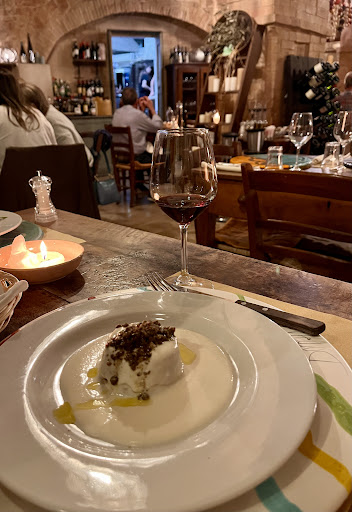 What a gem in the heart of Spello! The restaurant is set inside a rustic stone cellar with beautiful arches that immediately catch your eye – it feels like dining inside history. The unique ceramics from Domiziani, which you can also find in their shop just a few steps away, add an extra touch of character and colour to the tables.